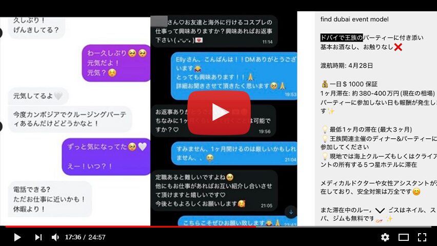 発端は、コスプレ界隈で以前からささやかれていた海外高額オファーDMの存在でした。内容は「ドバイでの滞在案件で高額報酬がもらえる」といったもので、数千万円規模の報酬や長期滞在など、通常の仕事では考えにくい条件が含まれていたといわれています。実際のDMの手口なども動画になっています。